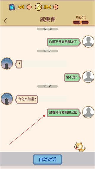 3、持续通过自动对话推进聊天流程,根据回复提升舔狗值。