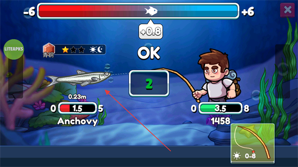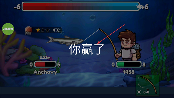 4、持续调整力度直至鱼的体力耗尽,成功钓起鱼后获得奖励,推进游戏进度。