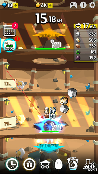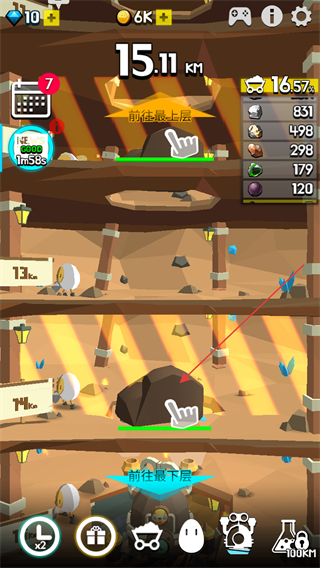 3、持续击碎每层的岩石,积累资源并解锁更深地层,同时收集掉落的道具如宝箱。