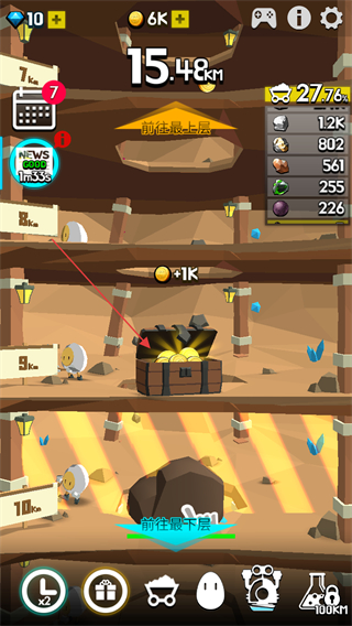 4、打开宝箱获取额外奖励如1K金币,继续向下挖掘,提升挖掘进度和资源收益。