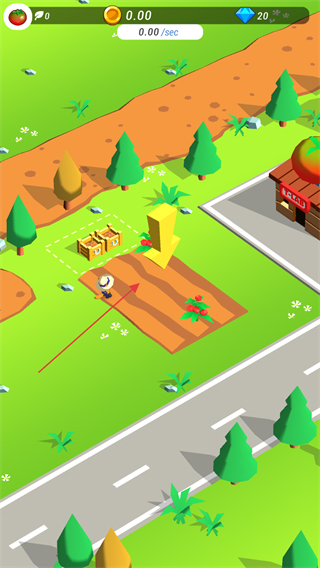 1、点击农田区域,触发作物种植如番茄,自动收获作物并积累金币。