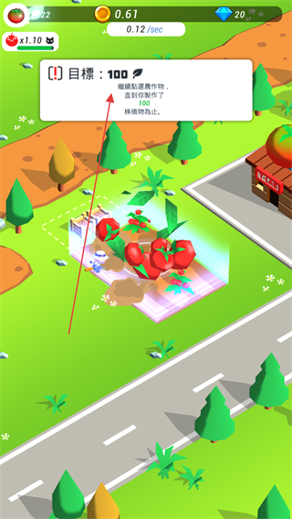 2、持续点击农田可加速作物生长和收获,提升金币获取速度,向收集100番茄的目标推进。
