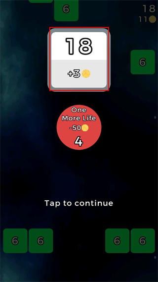 4、游戏结束后出现结算界面,点击Taptocontinue按钮,可结束当前局并准备重新开始。