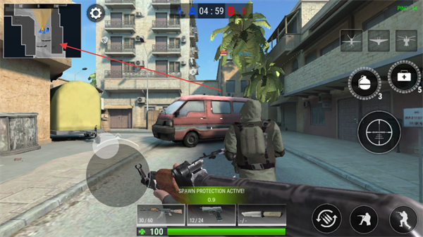 1、参考左上角地图规划移动路线,利用建筑、载具等掩体隐蔽自身,避免暴露在敌方火力下。