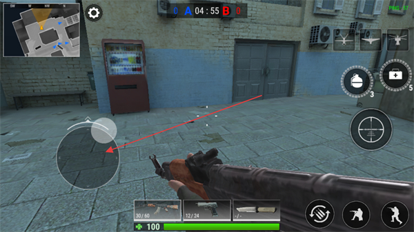 2、操控虚拟摇杆移动角色,利用场景掩体躲避敌方攻击。