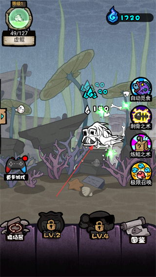 1、在等级1中,鲲自动攻击获取资源,界面显示49/127进度,可使用右侧功能辅助。