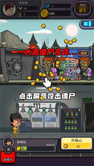 2、当僵尸来袭时,点击屏幕攻击僵尸,击退敌人的同时获取金币奖励。