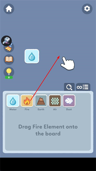 2、找到界面下方的火元素图标,将其拖动至上方已放置水元素的操作区域中,完成火元素的放置操作。