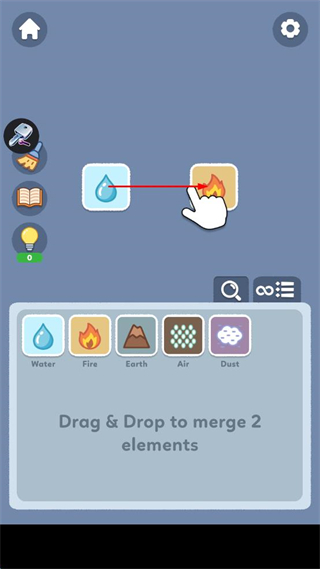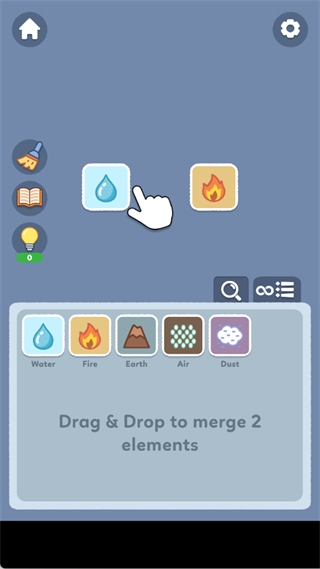 3、将操作区域内的水元素拖动至火元素的位置处,使两个元素发生接触,触发合成交互动作。