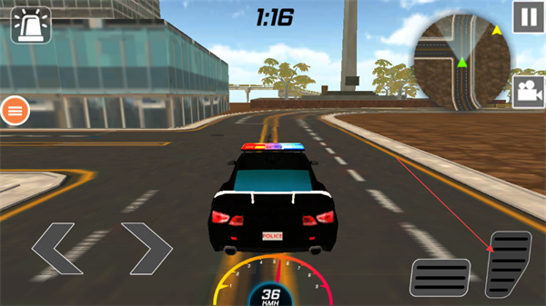 1、操控警车通过左右按钮调整方向、油门键加速,根据小地图指引追击目标车辆。