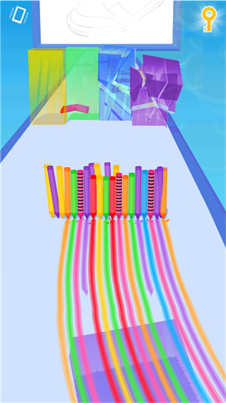 1、操控彩色笔列在通道上移动,收集沿途的同色笔,增加笔列的数量,丰富颜色种类。