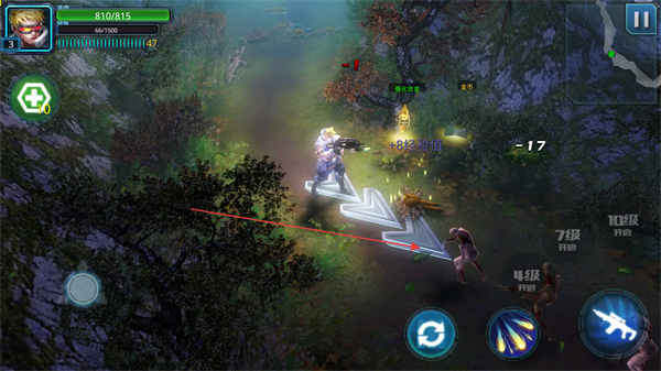 2、操控角色移动,用武器攻击僵尸,击败后获取+82经验值,积累经验提升等级。