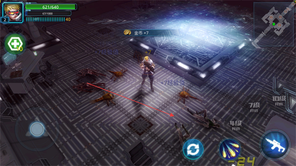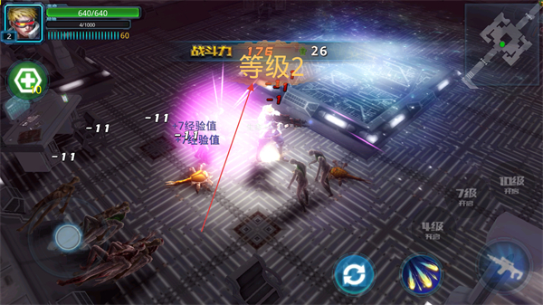 1、释放技能攻击集群僵尸,获取7级经验值提升至等级2,增强战斗力,持续清理周围敌人。