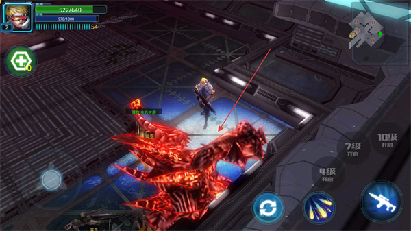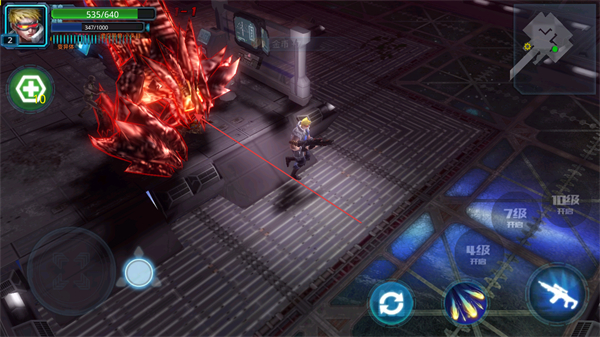 3、躲避巨型红色僵尸的攻击,保持移动拉开距离,避免被其范围技能命中,减少血量损耗。