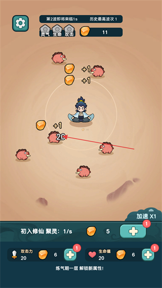 1、操控修仙角色自动攻击周围妖怪,收集橙色道具提升属性+1,积累灵气推进游戏。