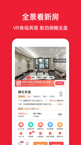 房天下作为一款有直播开房功能的专业房产软件,提供租房、新房、二手房等相关服务,平台引入了全景AR看房功能,使用全新VR技术,给你身临其境般的尝试,能让用户看清楚房子的所有细节,让你能更好地去筛选,同时也节省了大量宝贵时间,不用所有房子都去现场看。