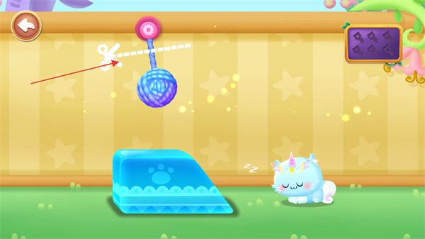 2、使用剪刀剪断悬挂绳,让毛线球下落,小猫随之困倦,完成此步操作。