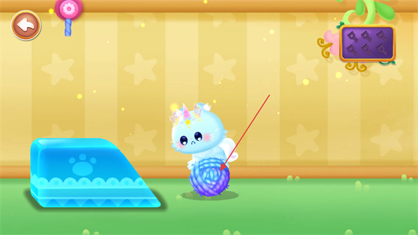 1、观察场景,看到毛线球悬挂着,还有小猫和蓝色平台,需规划互动步骤。