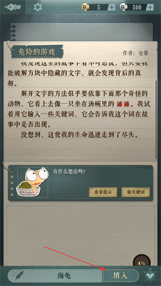 2、在输入框填写关键词海龟,点击填入提交,推进文字解谜。