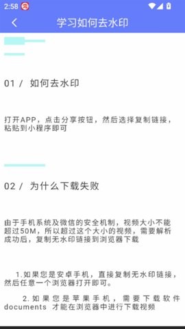 由于手机系统及微信的安全机制,视频大小不能超过50M,所以超过这个大小的视频,需要解析成功后,复制无水印链接到浏览器下载