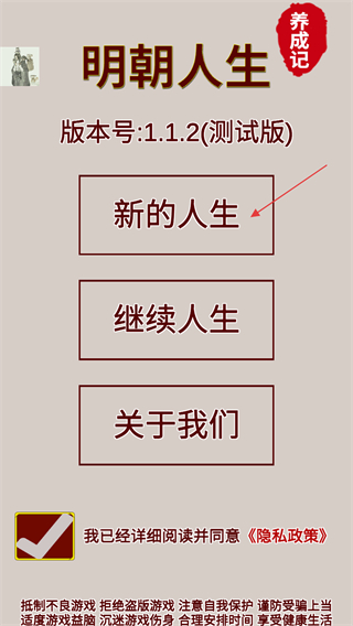 1、点击新的人生进入游戏,开启明朝人生养成流程。