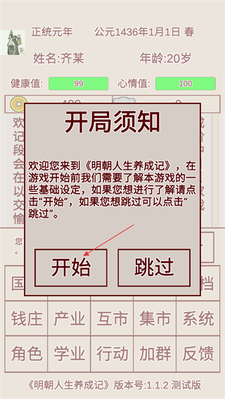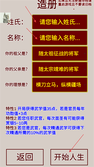 2、在造册界面输入姓氏、名称,确认祖辈、理想等初始设定,点击开始人生进入游戏。