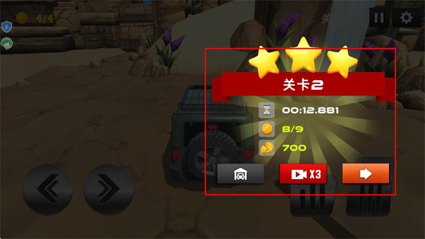 4、完成关卡2的驾驶任务后,界面会显示三星评价及奖励,点击右侧箭头按钮进入下一关。