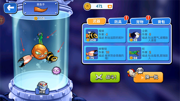 1、消耗金币解锁等宠物装备到八爪鱼,提升防御属性,强化战力后点击战斗进入下一关。