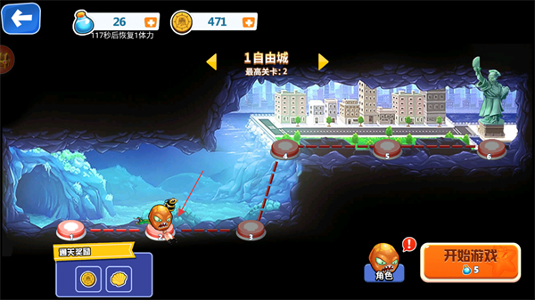 2、在地图界面选择路线,点击开始游戏进入下一关,继续推进游戏进度。