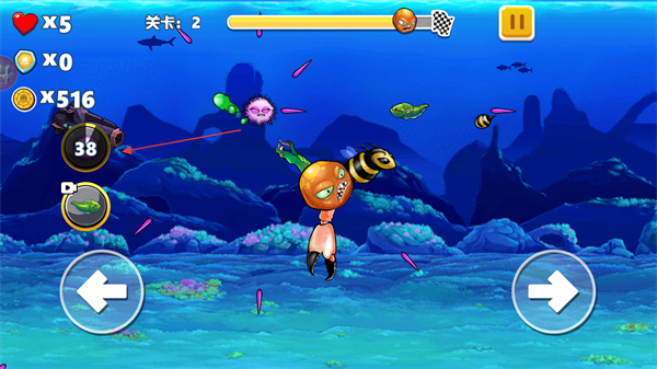 3、操控左右箭头移动八爪鱼,躲避攻击,借助宠物技能击败敌人,推进关卡进度。
