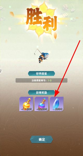 3、战斗胜利后,查看获得的奖励道具,点击确定按钮领取奖励,继续后续的探索进程。