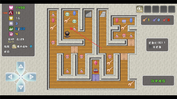 1、操控摇杆移动角色,在迷宫区域探索,收集钥匙等道具,推进流程。