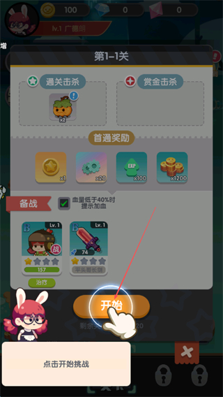 2、在第1-1关备战界面,确认阵容后点击开始,进入战斗环节。