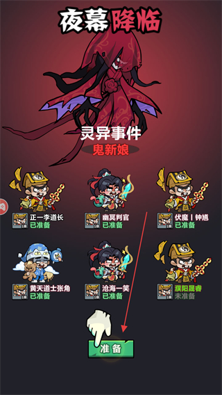 1、选择已准备的角色,点击准备进入夜幕降临关卡,挑战鬼新娘灵异事件。