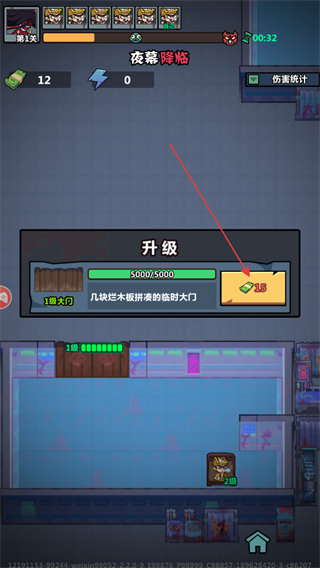 2、消耗13金币升级大门,提升防御,大门显示为几截木桩拼接的破烂大门。