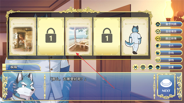 1、选择解锁的场景卡片,推进剧情,角色对话那么,去哪里好呢?,点击NEXT继续。