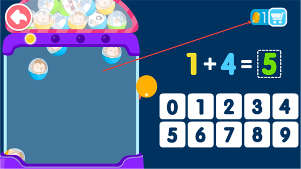 3、计算1+4=5,答对后获取金币奖励,继续下一题。