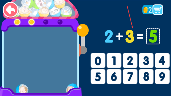 4、计算2+3=5,答对后积累金币,推进学加减流程。