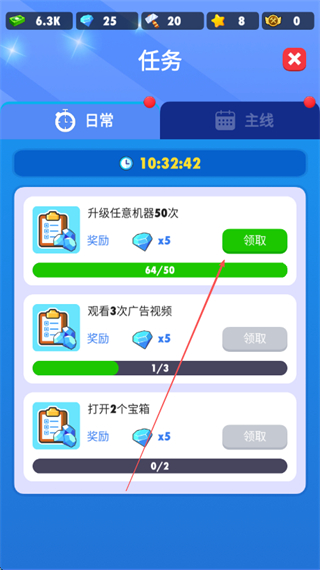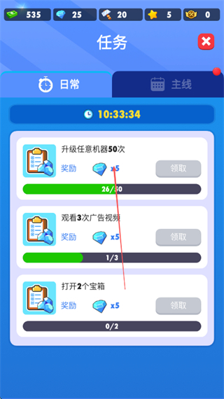 1、在任务界面查看升级任意机器50次的日常任务,明确目标。