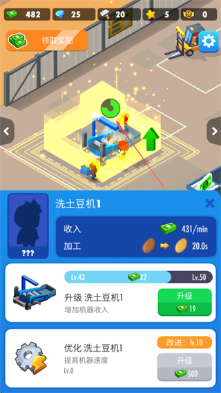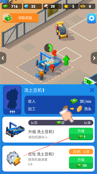 2、返回工厂界面,点击洗土豆机的升级按钮,消耗资源提升机器等级。