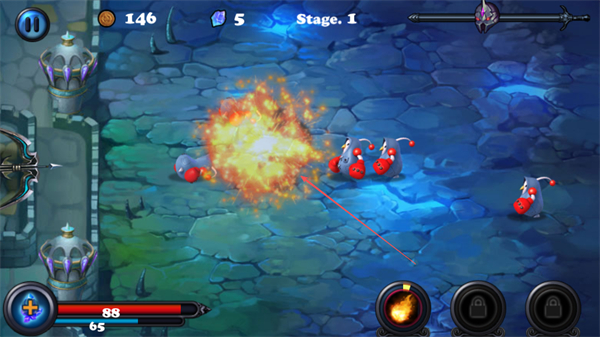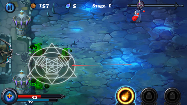 1、在Stage.1场景中,操控守卫攻击来袭的怪物,积累金币资源。