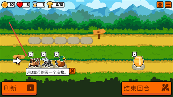 2、每回合获得金币后,在商店区域花费对应金币购买小动物随从,购买后随从会自动进入阵容空位。