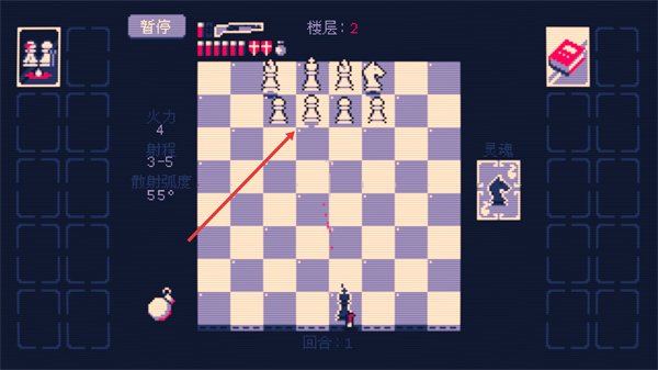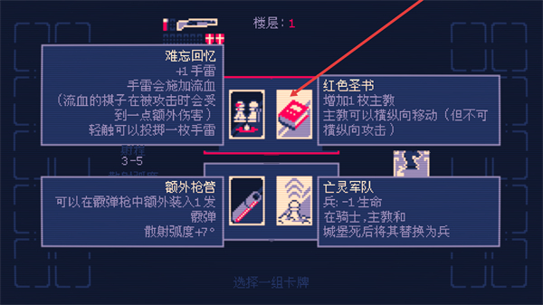 3、通关楼层后会出现卡牌选择界面,可挑选红色圣书卡牌,获得新增棋子、强化武器属性等效果,提升后续关卡的战斗能力。