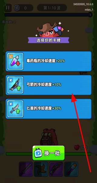 3、击败一定数量敌人后,会出现技能卡牌选择界面,挑选对应武器的冷却加速等技能,选好技能后可继续推进对战,提升战斗效率。