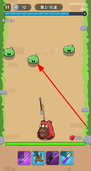 4、进入第2波对战后,使用已配置的武器攻击场上出现的敌人,累计杀敌数推进关卡,保持生命值稳定,每波结束后可调整武器配置。