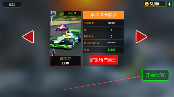 1、选择赛事如跟踪#1,点击开始比赛进入1圈的赛道竞速。