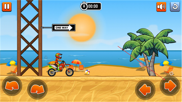 1、通过方向键操控摩托,沿沙滩赛道前进,遵循ONEWAY标识的方向行驶。