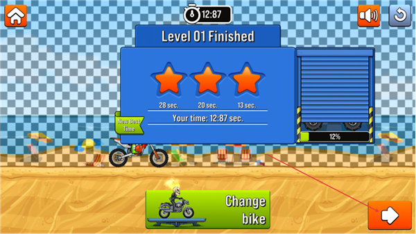 4、完成赛道后获得三星评价,点击箭头按钮进入下一关,可选择Changebike更换车辆。