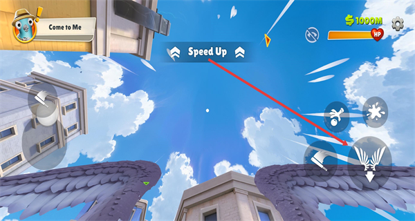 3、点击右侧的翅膀按钮,切换为飞行模式,配合陀螺仪向上可开启高空移动状态。