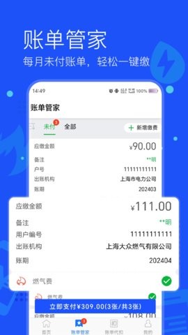 付费通app作为一款专注于账单支付与查询的软件,非常便捷好用的一站式电子账单查询与支付平台,生活中的各类账单都能一键快速查询,水费、电费、天然气、手机电话费、宽带费、有线电视费用等,都可以轻松查询,看看哪些需要及时充值,赶快完成充值避免欠费停用。